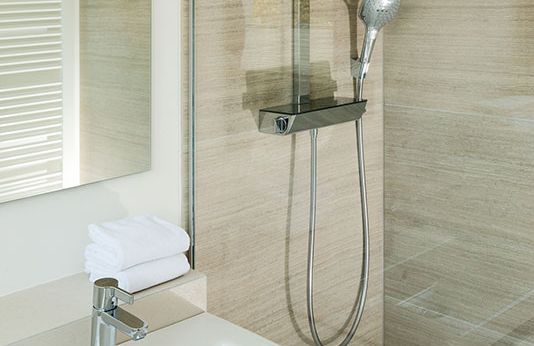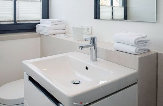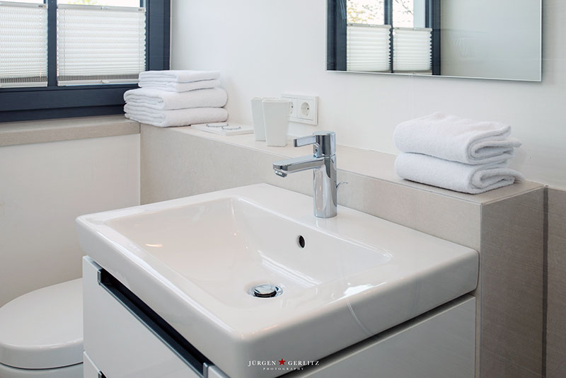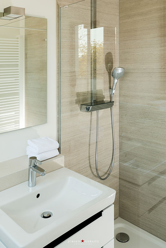 Das Bad stellt mit seinen modernen Objekten und den hochwertigen Accessoires (Fön, Kosmetikspiegel etc.) ein komfortables Mini-Spa dar.
