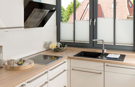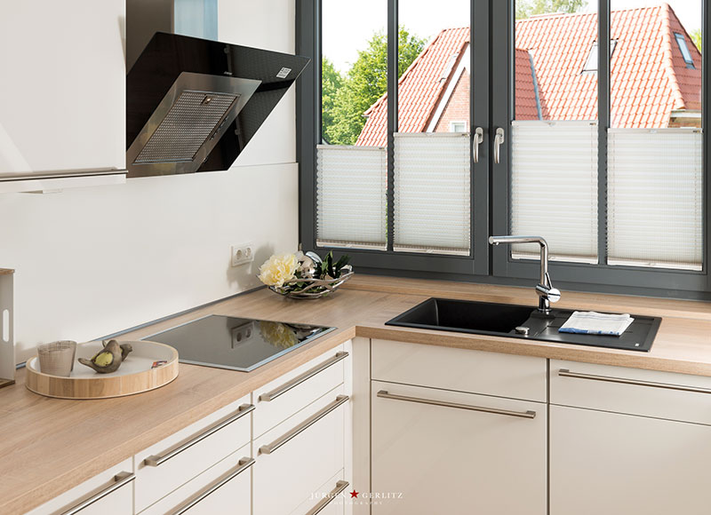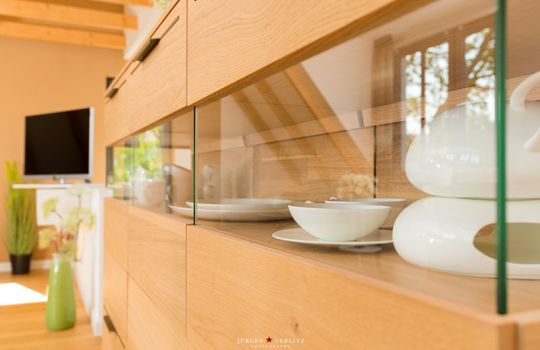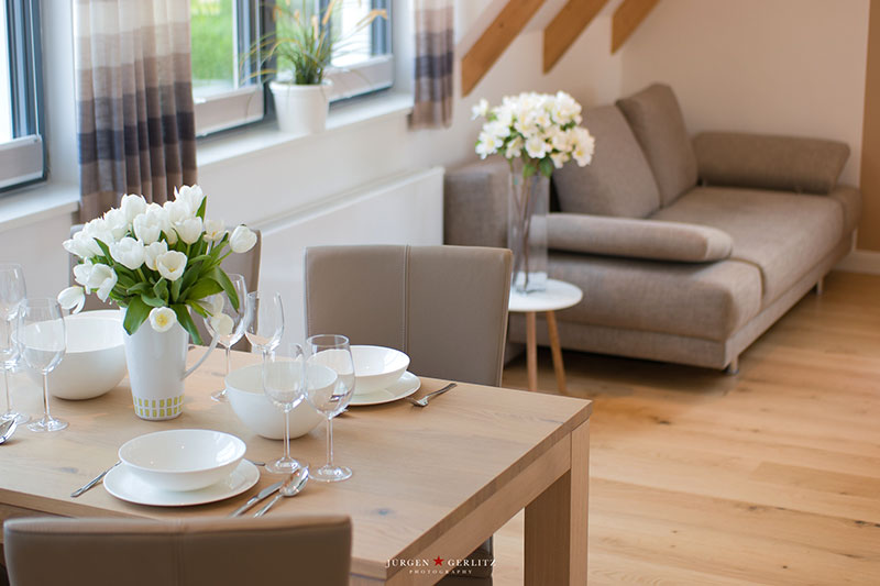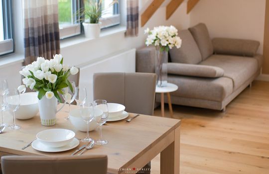 Die hochwertige Küche ist modern, komfortabel und voll ausgestattet. Der Essbereich mit schönem Holztisch bietet Platz für 4-6 Personen.