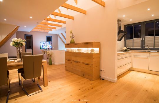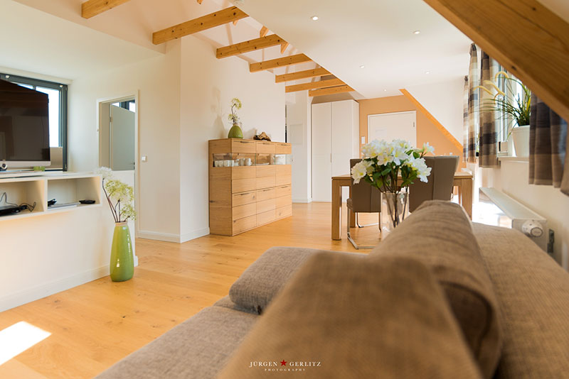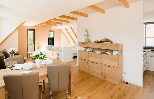 In der Wohnung eröffnet sich der Blick auf das individuell gestaltete offene Dachgeschoss mit seinen unterschiedlichen Bereichen.